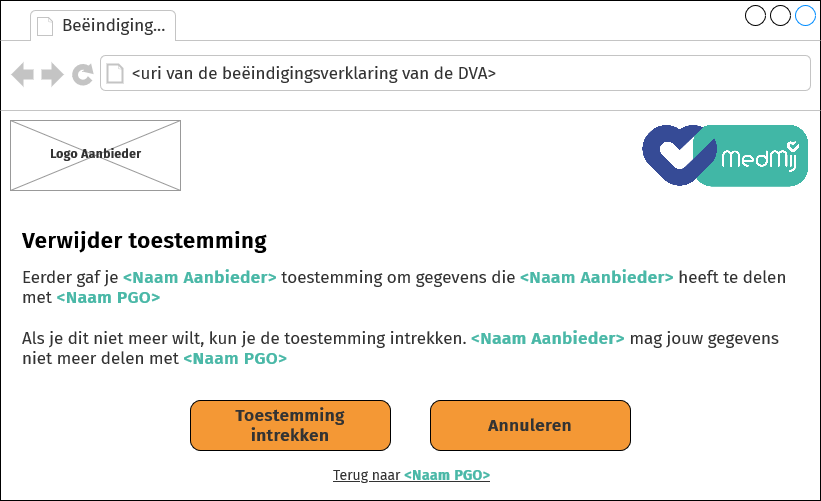 Titel: Beëindiging toestemming Eerder gaf je <Naam Aanbieder> toestemming om gegevens die <Naam Aanbieder> heeft te delen met <Naam PGO> Als je dit niet meer wilt, kun je de toestemming intrekken. <Naam Aanbieder> mag jouw gegevens niet meer delen met <Naam PGO> |