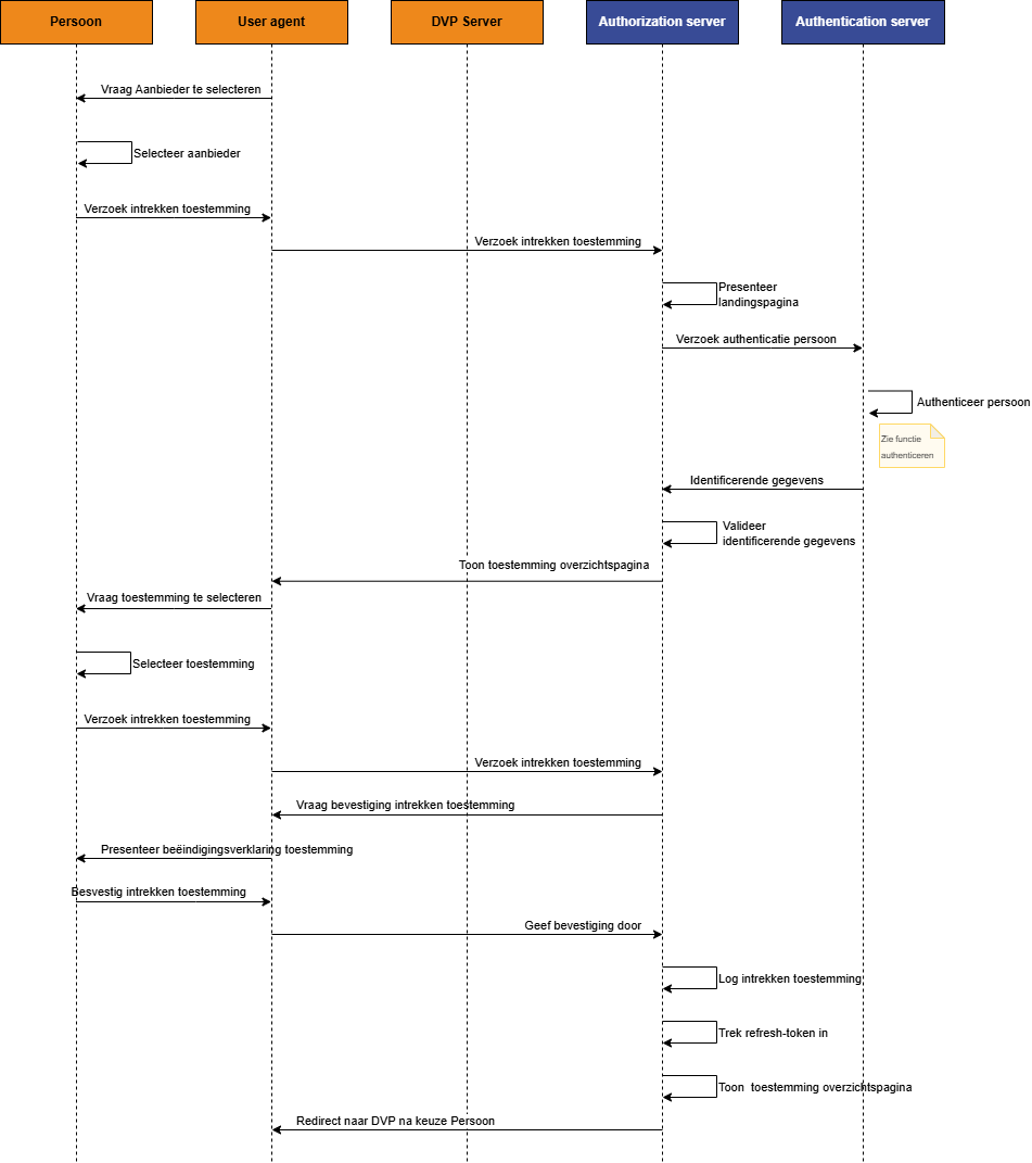 11. Bij bevestiging door de Persoon logt de Authorization Server het intrekken van de toestemming en trekt het refresh-token in.
