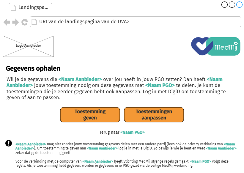 De Dienstverlener aanbieder dient de landingspagina (met mogelijkheid om in te loggen) aan de Persoon voor te leggen wanneer de Persoon gezondheidsgegevens wil uitwisselen met de Aanbieder en er nog geen toestemming (voor onbepaalde tijd) is gegeven. Daarnaast moet de Dienstverlener aanbieder ditzelfde scherm tonen als de Persoon bestaande langdurige toestemmingen wil beheren.