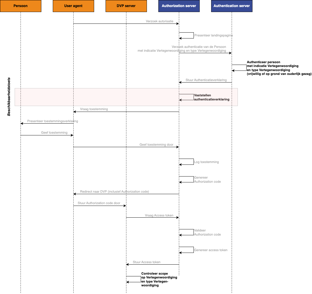 De DVP server kan deze situaties alleen vaststellen als de DVP server vrijwillige Vertegenwoordiging en/of Vertegenwoordiging op basis van het ouderlijk gezag ondersteunt. Omdat deze extensie optioneel is voor alle deelnemers, kan de situatie zich voordoen dat de uitzondering wel van toepassing is, maar niet opgemerkt wordt door de DVP Server. Daarom heeft ook de Authorization Server de verantwoordelijkheid controles uit te voeren. Deze staan beschreven bij de Authorization interface.