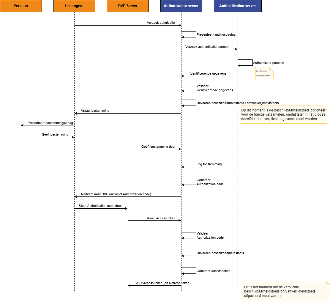 2. de Authorization Server ervoor instaat dat voor de betreffende Gegevensdienst de Aanbieder ontvankelijk is voor de gezondheidsgegevens van de betreffende Persoon. Is dat zo, dan verstuurt de Authorization Server het access-token naar de DVP Server. Is dat niet zo, dan breekt de Authorization Server de happy flow af en stuurt zij geen access-token naar de DVP ServerOp dit moment is de ontvankelijkheidstoets verplicht.
