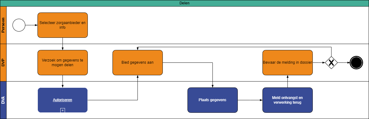 In de platen hieronder staat het diagram van de functie Delen. De diagrammen tonen alleen de situatie waarin alle acties slagen tot en met het uiteindelijke delen van de gezondheidsinformatie (de zogenaamde happy flow). De oranje banen horen (conform de MedMij-huisstijl) tot het Persoonsdomein, de blauwe tot het Aanbiedersdomein.