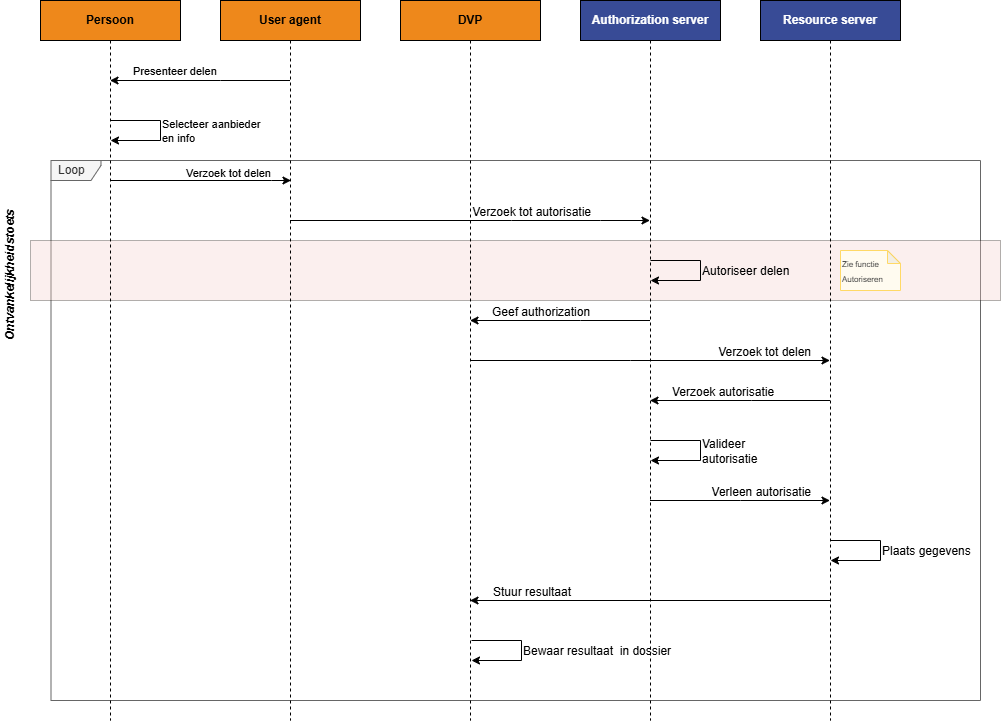 In de regel worden bij een eenmalig gebruik van de functie Delen het authorization interface, het token interface en het resource interface allemaal aangesproken, in die volgorde. Mocht de DVP Server echter nog beschikken over een nog niet verlopen access token voor de betreffende Aanbieder-Gegevensdienst-combinatie, dan kan het onmiddellijk het resource interface aanspreken.
