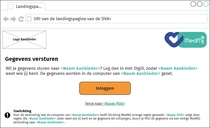 Titel: Gegevens versturen Wil je gegevens sturen naar <Naam Aanbieder>? Log dan in met DigiD, zodat <Naam Aanbieder> weet wie jij bent. De gegevens worden in de computer van <Naam Aanbieder> gezet. Toelichting Voor de verbinding met de computer van <Naam Aanbieder> heeft Stichting MedMij strenge regels gemaakt. <Naam PGO> volgt deze regels. Als <Naam Aanbieder> zeker weet wie jij bent en de gegevens wil ontvangen, stuurt je PGO de gegevens via een veilige MedMij-verbinding naar <Naam Aanbieder>. |
