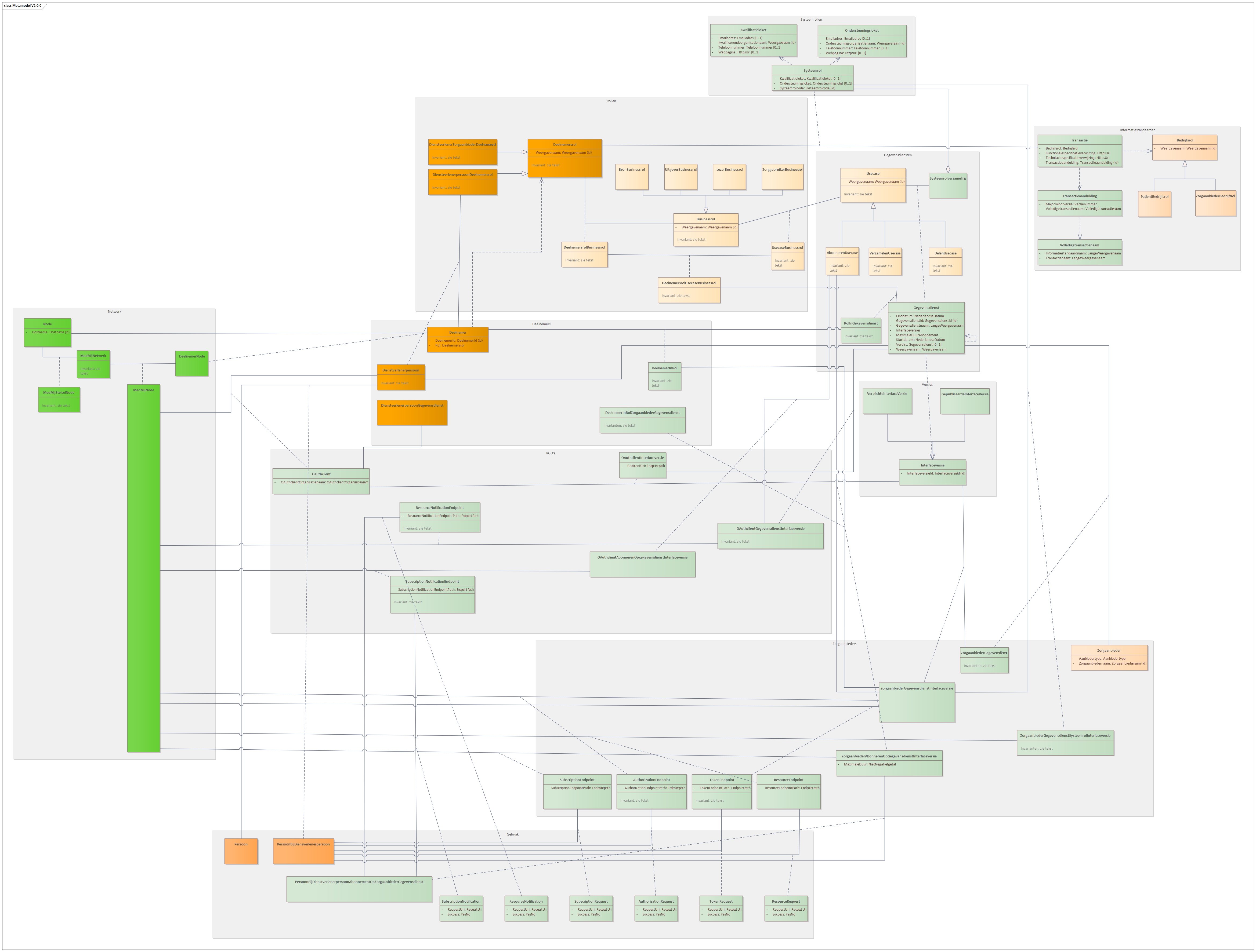 De klassen in het metamodel horen bij de verschillende lagen in de architectuur van het afsprakenstelsel. De betreffende laag is aangegeven door de inkleuringen van de klassen.