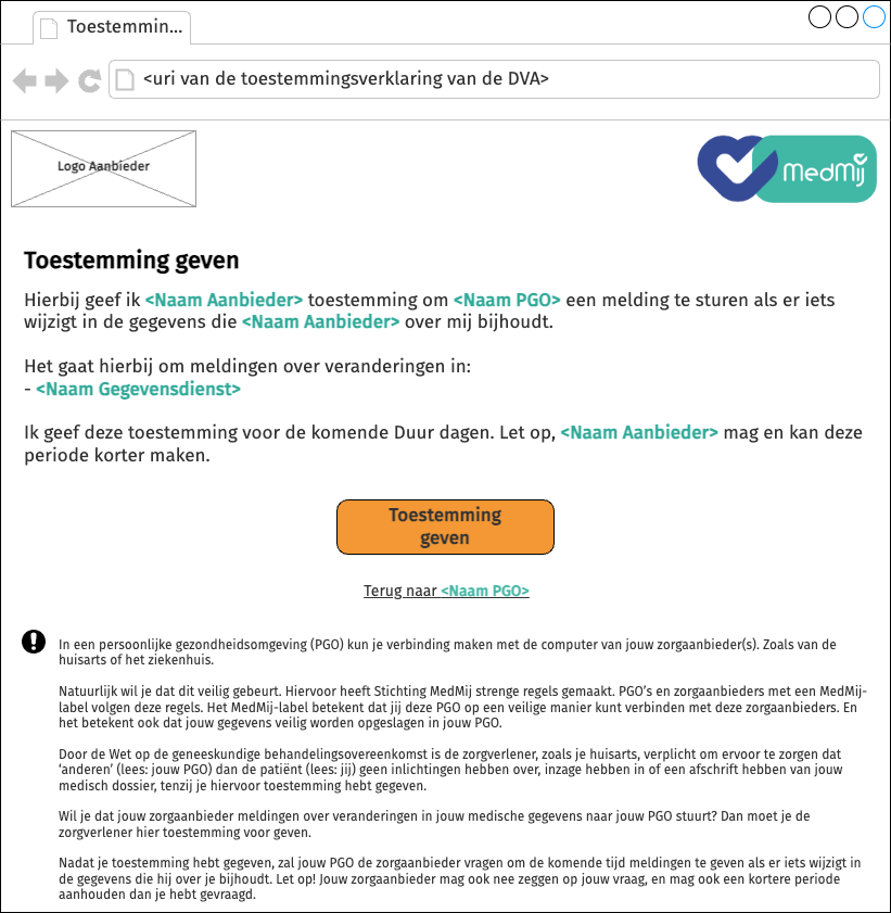 Toestemmingsverklaring Hierbij geef ik Het gaat hierbij om meldingen over veranderingen in: Ik geef deze toestemming voor de komende Toelichting op de toestemmingsverklaring In een persoonlijke gezondheidsomgeving (PGO) kun je verbinding maken met de computer van jouw zorgaanbieder(s). Zoals van de huisarts of het ziekenhuis. Natuurlijk wil je dat dit veilig gebeurt. Hiervoor heeft Stichting MedMij strenge regels gemaakt. PGO’s en zorgaanbieders met een MedMij-label volgen deze regels. Het MedMij-label betekent dat jij deze PGO op een veilige manier kunt verbinden met deze zorgaanbieders. En het betekent ook dat jouw gegevens veilig worden opgeslagen in jouw PGO. Door de Wet op de geneeskundige behandelingsovereenkomst is de zorgverlener, zoals je huisarts, verplicht om ervoor te zorgen dat ‘anderen’ (lees: jouw PGO) dan de patiënt (lees: jij) geen inlichtingen hebben over, inzage hebben in of een afschrift hebben van jouw medisch dossier, tenzij je hiervoor toestemming hebt gegeven. Wil je dat jouw zorgaanbieder meldingen over veranderingen in jouw medische gegevens naar jouw PGO stuurt? Dan moet je de zorgverlener hier toestemming voor geven. Nadat je toestemming hebt gegeven, zal jouw PGO de zorgaanbieder vragen om de komende tijd meldingen te geven als er iets wijzigt in de gegevens die hij over je bijhoudt. Let op! Jouw zorgaanbieder mag ook nee zeggen op jouw vraag, en mag ook een kortere periode aanhouden dan je hebt gevraagd. |
